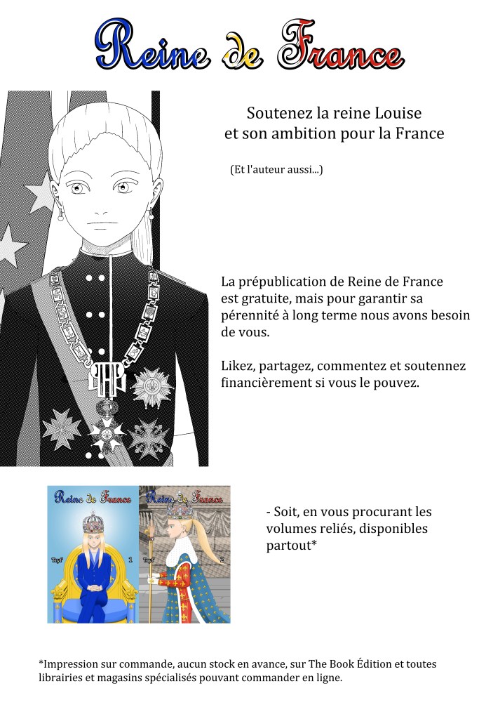 Reine de France se poursuit, avec la reprise de la prépublication mercredi 24 septembre et la sortie du chapitre 22.