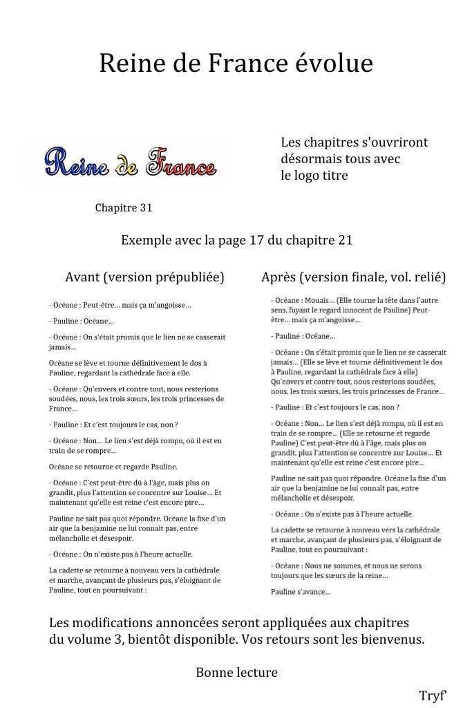 Sachez tout de même que j’ai passé une bonne partie du mois de novembre à réécrire le premier volume avec cette nouvelle mise en page, en plus des autres ajouts effectués ultérieurement et d’un début de compréhension de mes erreurs, et il y a une vraie différence. Donc je crois que ces nouveautés aideront vraiment, mais peut-être que je me trompe et dans ce cas n’hésitez pas à me donner vos retours.