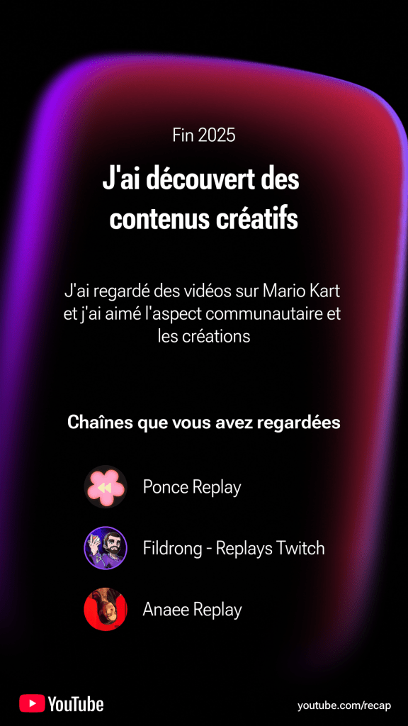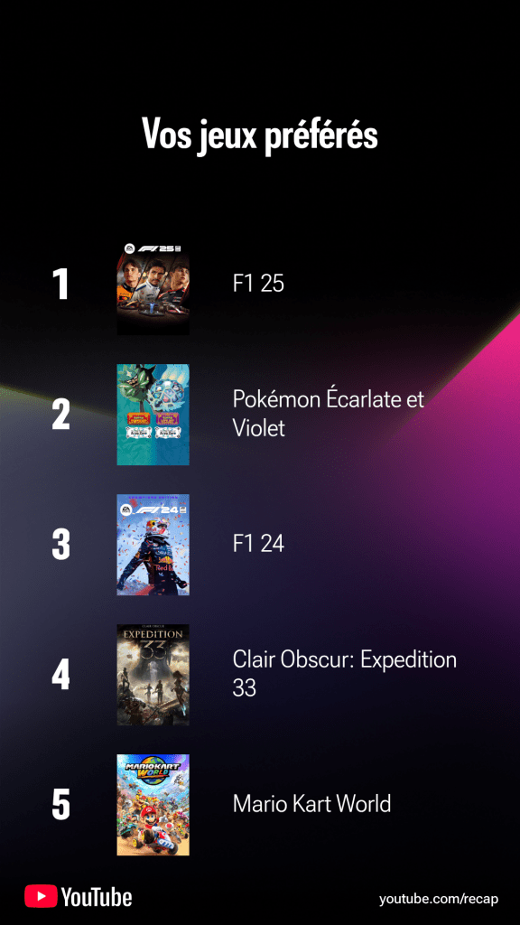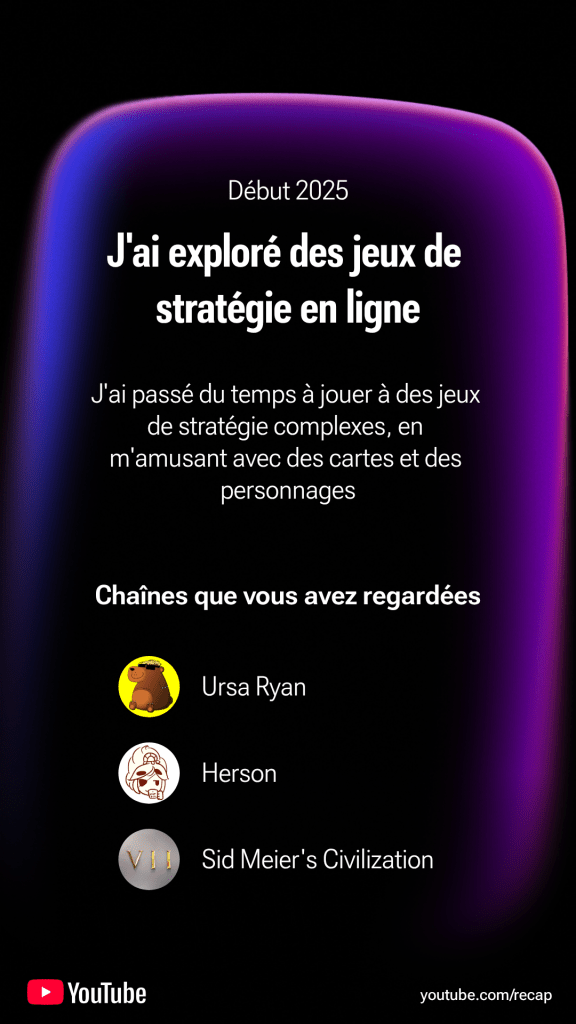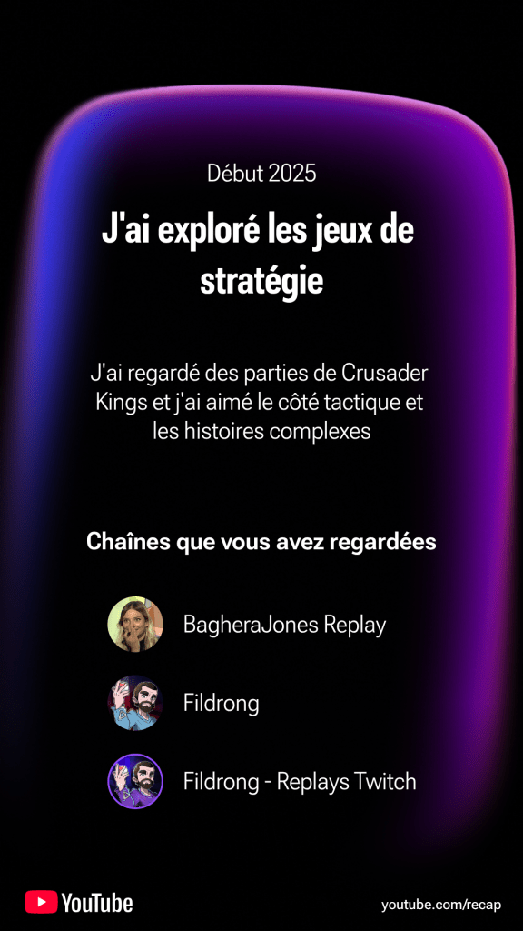 Pour autant je trouve que ce récap n’est pas si mal fait. Youtube indique d’entrée que l’IA peut faire des erreurs (oui, c’est de l’IA…) et il y a en effet des points étonnants, notamment ce qui est indiqué en début, milieu et fin d’année, ou les jeux préférés ( ou est Civ VII ? Et pourquoi Fifa ?). J’imagine que comme pour Twitch les données de Youtube ont été arrêtées assez tôt.