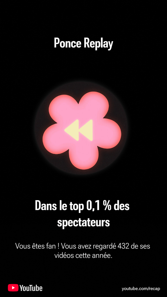 Déjà, je suis surpris d’être encore dans un Top 0,1% d’une chaîne, sachant que ce n’est pas une chaîne que je regarde tous les jours. Plus que Ponce c’est le Maître des Fleurs (dont j’ai regardé l’intégralité des rediffusions deux fois, soit environ 400 des 432 vidéos vues) qui est ma découverte de l’année et dont je suis devenu fan.