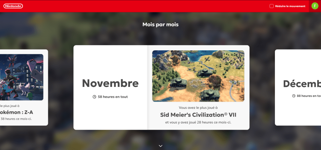 Je suis aussi un joueur régulier qui joue presque tous les jours. Je me fais des sessions d’une heure et demi/deux heures en général et les rares fois où je dépasse ce quota c’est quand un nouveau jeu sort. Ainsi octobre avec la sortie de Légendes Pokémon Z-A et décembre avec le DLC de Z-A et la mise à jour 1.3 de Civ 7 (et autre chose dont on parlera bientôt) sont les deux mois les plus prolifiques pour ma part.