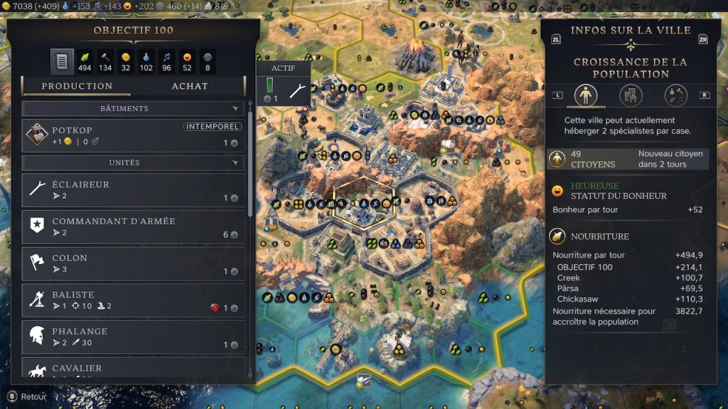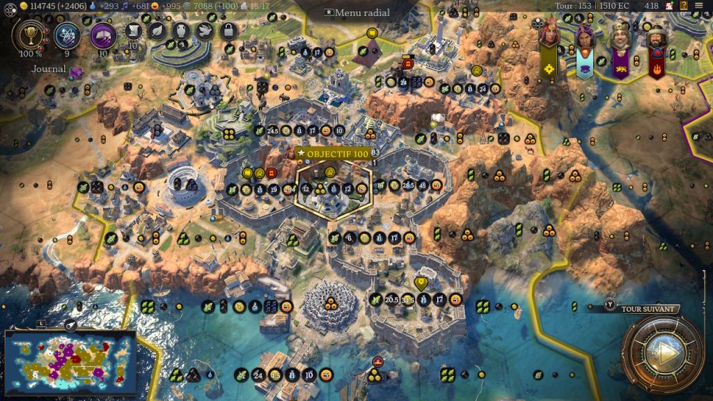 Ainsi, le nombre important de bâtiments permet aux villes d’obtenir une croissance bien plus forte. Les villes de Civ VII peuvent monter à 30 habitants dès l’Antiquité, et 55/60 en fin de partie sans grande difficulté, là où dans le 6 elles arrivaient difficilement à 20/25 pour la plupart. Le tout sans bonus majeur.