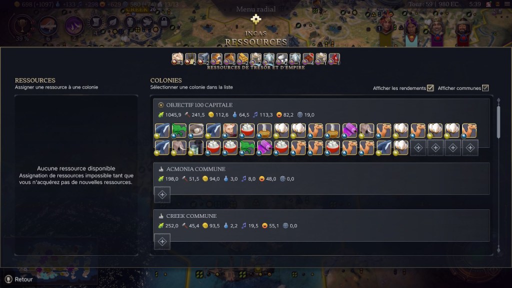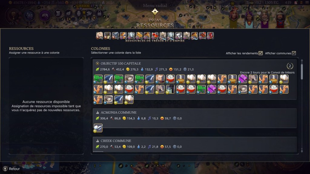 Dépasser la limite de colonies crée un malus en bonheur. Mais les communes n’ont que très peu de malus et en génèrent naturellement. Résultat j’étais en célébration permanente depuis le tour 124… de l’Antiquité.