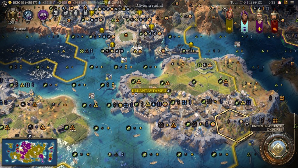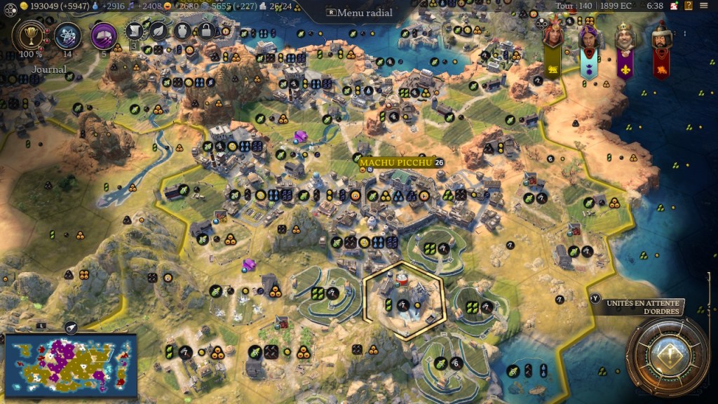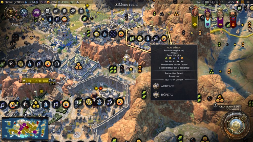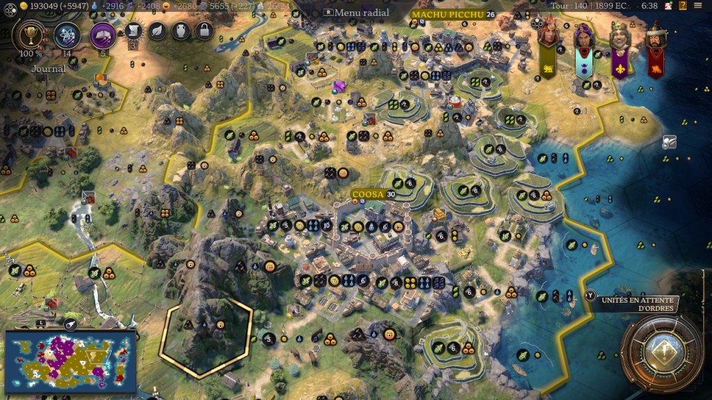 Après, soyons honnêtes : les points les plus impactants pour la croissance de notre ville n’ont pas été les bonus de Pachacutec mais bien la spécialisation des communes durant les deux premières ères, et la promotion « zèle » des commandants durant la dernière. Seule la civ Inca a des bonus qui marquent une grosse différence dans ce qui a été utilisé (les cultures en terrasse se trouvant dans les communes).