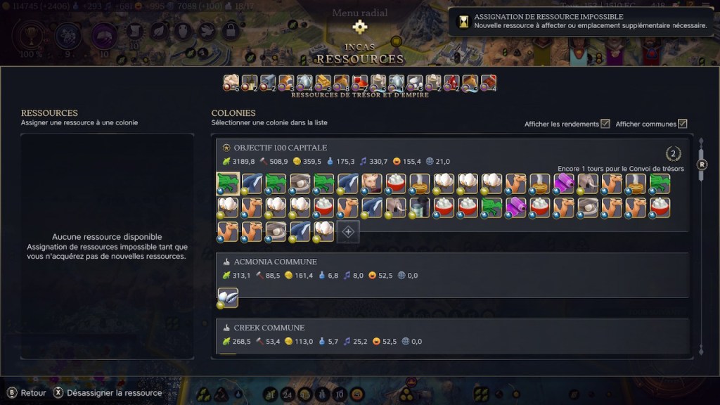 L’avancée des âges est également accélérée avec l’obtention des héritages (les points in-game à marquer). Ceux qui ne sont pas essentiels pour notre objectif sont donc retirés. Seul l’héritage militaire Pax Imperatoria est actif durant l’Antiquité : son deuxième point permet d’obtenir un bonus en limite de colonies pour l’ère suivante.