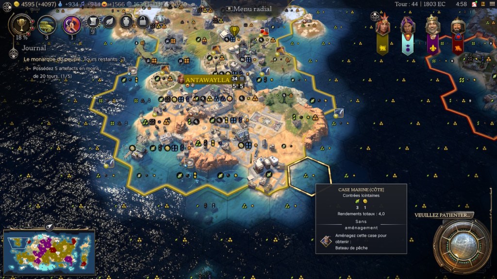 À ce stade je sais qu’on est nettement en avance sur l’objectif. Jamais je n’avais eu une ville aussi peuplée à la fin de l’ère de l’exploration, et sachant que certains bonus des Incas seront conservés, la réussite de l’objectif semble déjà certaine.