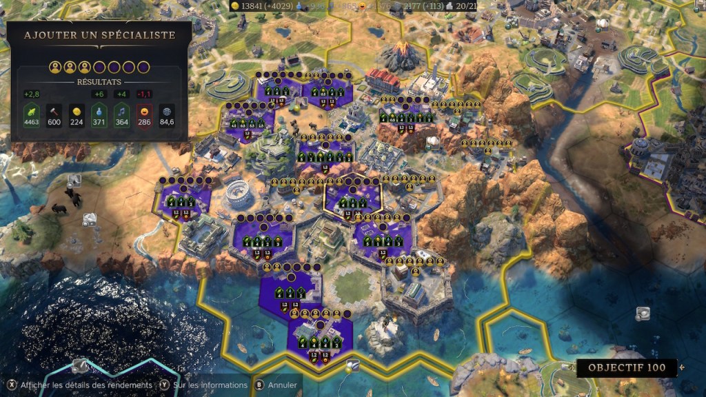À la sortie du jeu, le système de croissance des villes était totalement différent d’aujourd’hui. Il a été lissé pour rendre le rendement nourriture aussi bon que les autres. J’avais déjà testé cet objectif de 100 habitants dans une ville, mais avait échoué à 83 habitants. Ma méconnaissance du jeu qui venait de sortir, en plus des héritages qui ne pouvaient pas être désactivés, avaient fait échoué cet objectif.