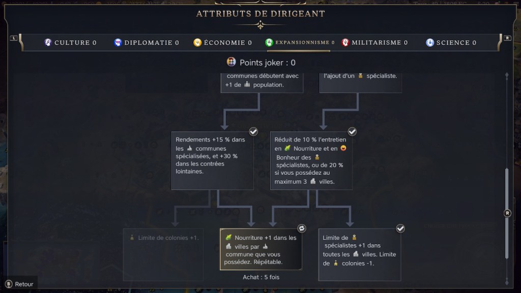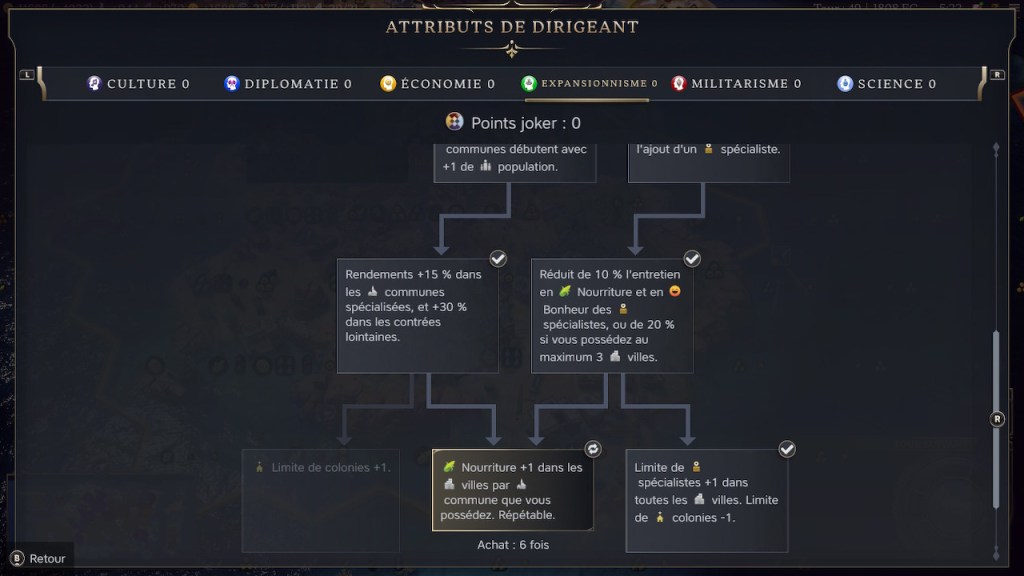 Nombre de bonus dans les attributs de dirigeants sont doublés lorsqu’une civ possède un maximum de 3 villes. Ils sont actifs dans cette partie, dont celui sur la nourriture et le bonheur.