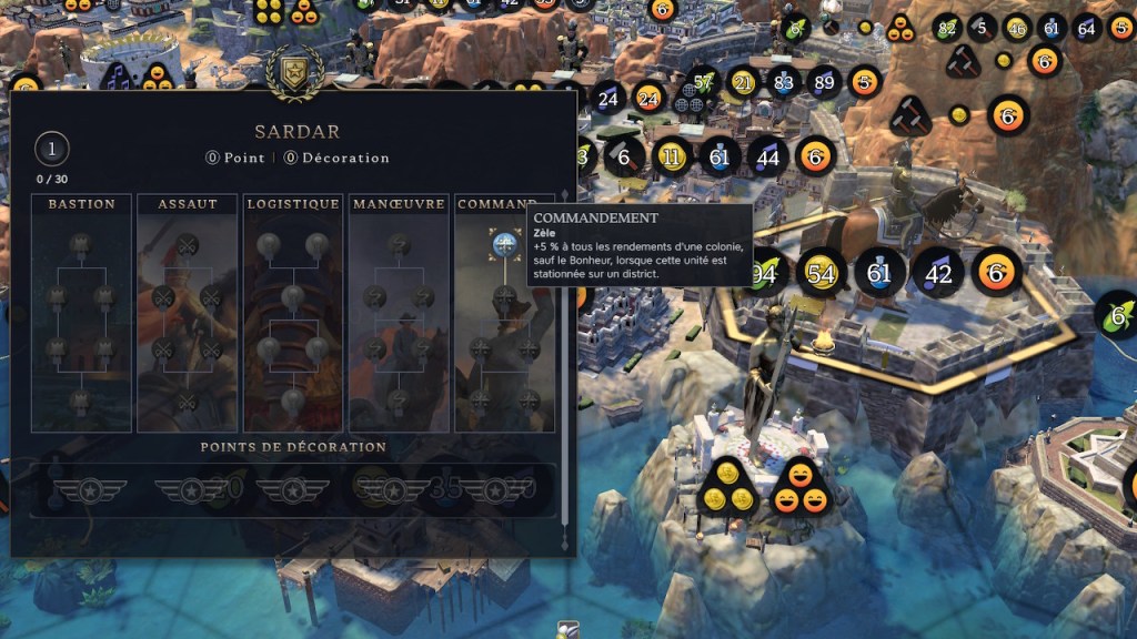 Même ici, il faudra utiliser un dirigeant, et des civ, avec des bonus notables sur ce qui contribue à la croissance des villes : la nourriture donc, mais également le bonheur, la gestion des ressources et l’entretien des spécialistes.