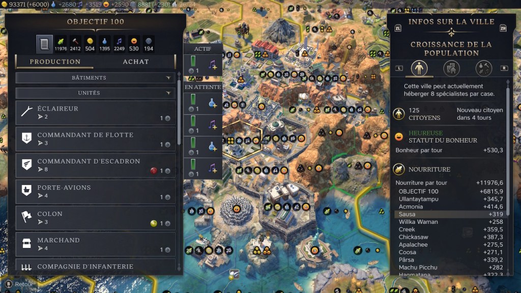 Les rendements deviennent rapidement monstrueux, notamment sur les quartiers adjacents aux montagnes. Le bonus de Pachacutec, de son souvenir et le communisme, coupé aux bâtiments spécialisés en nourriture, nous amènent à des nombres que je n’avais jamais vu auparavant.
