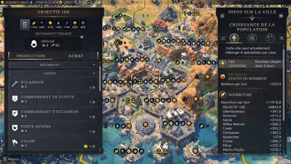 Ça rejoint finalement l’une des principales critiques, je crois, du jeu : la plupart des civilisations et leaders n’ont pas des bonus assez forts pour les démarquer des autres. 100 habitants dans une ville, vous pouvez le faire avec n’importe quel dirigeant et n’importe quelle civ. Peut-être n’atteindrez-vous pas 133 comme ici, mais je crois que c’est faisable.