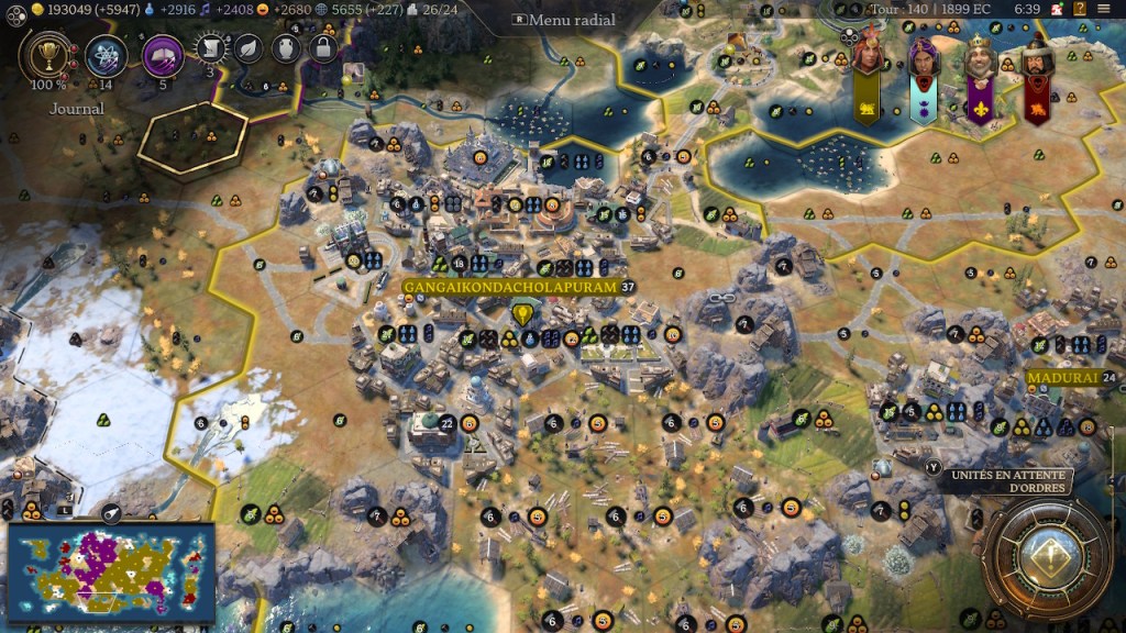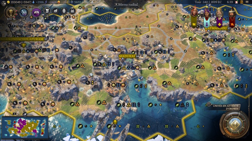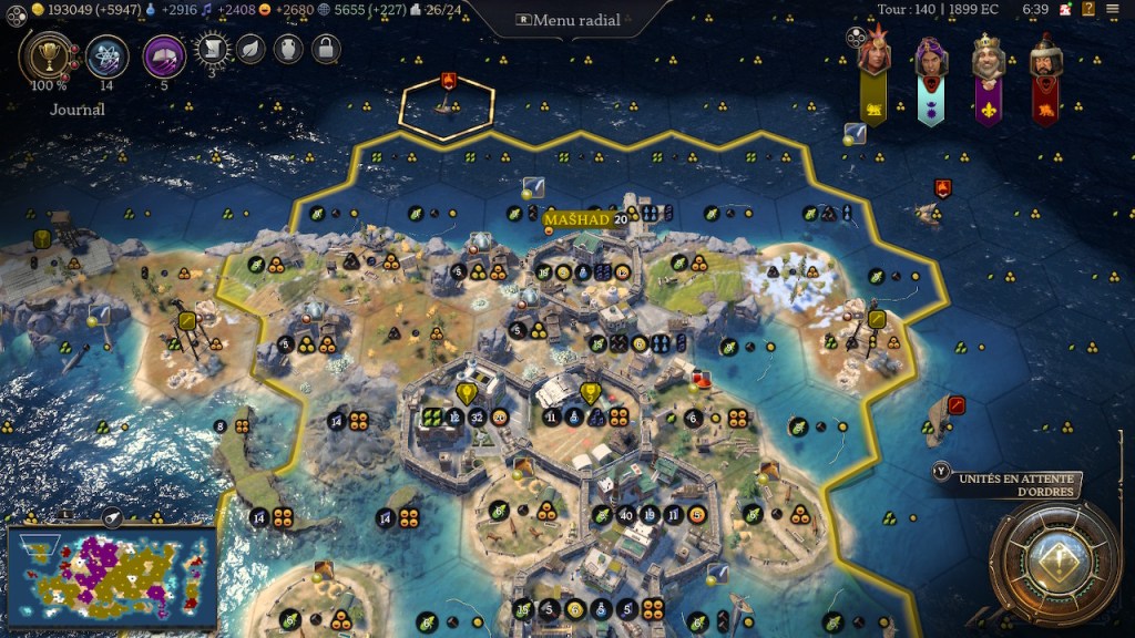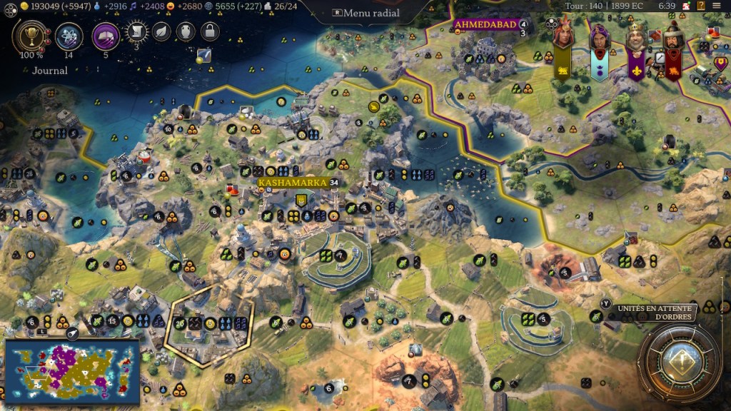 Au-delà je n’ai jamais vu une ville afficher de telles stats seule : 2400 de production, 1500 de science, 1200 de culture, 500 de bonheur (non pris en compte dans « zèle »). La capitale générait presque à elle seule le bonheur nécessaire pour être en célébration permanente.